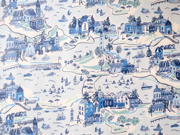 地図のような風景柄は、大きめの面積で使うことで細部まで楽しめるのが魅力。