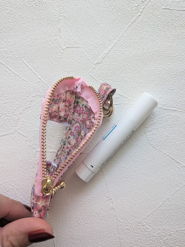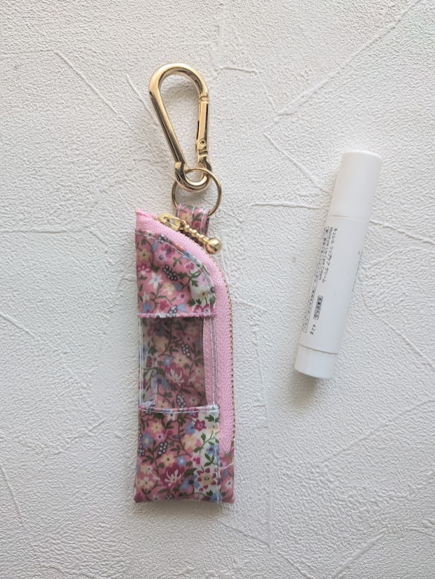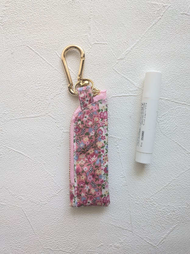 長めのリップクリーム(約8×2cmの円柱サイズ)が入る、縦約11cm・幅4cm弱の 縦型ポーチ として仕上げました。