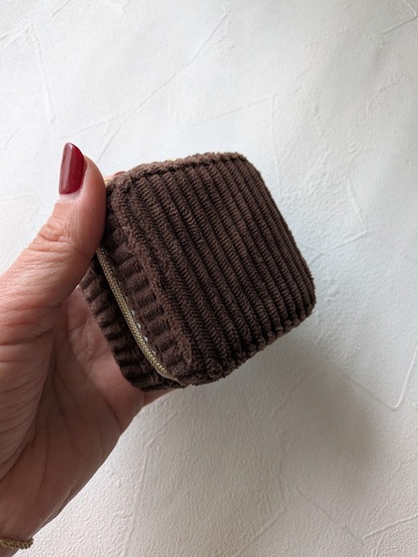 外側はブラウンの起毛素材、内側はクッション性のあるフェルト地。手のひらサイズで持ち歩きやすく、チャーム付きでぶら下げることもできます。