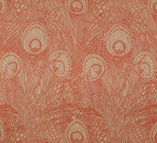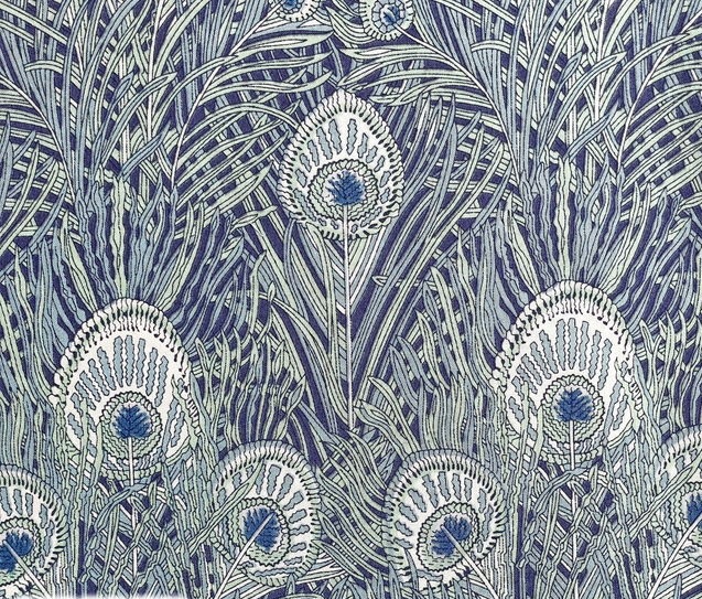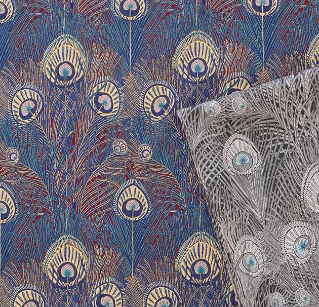 左右対称に配置された孔雀、流れるような羽のライン。その美しさは、どこかアールヌーヴォーの装飾美も感じさせます。