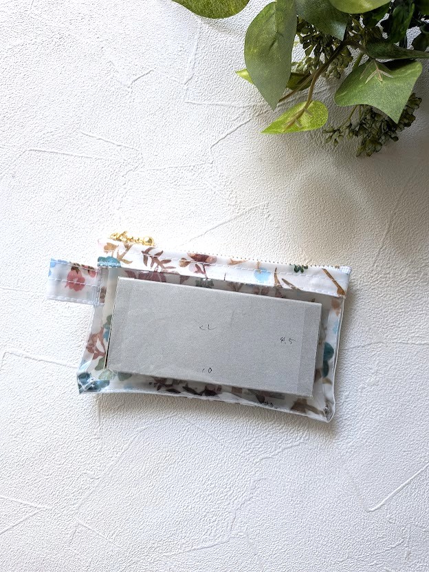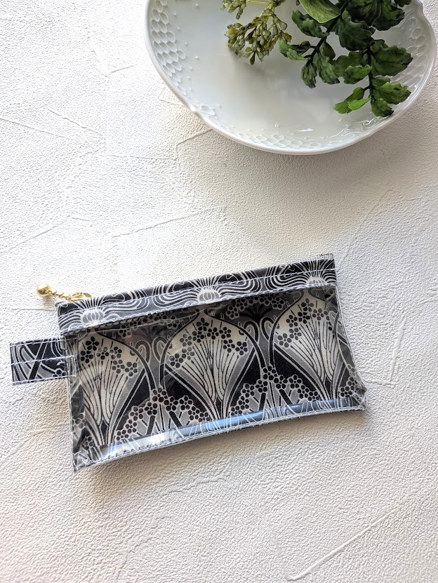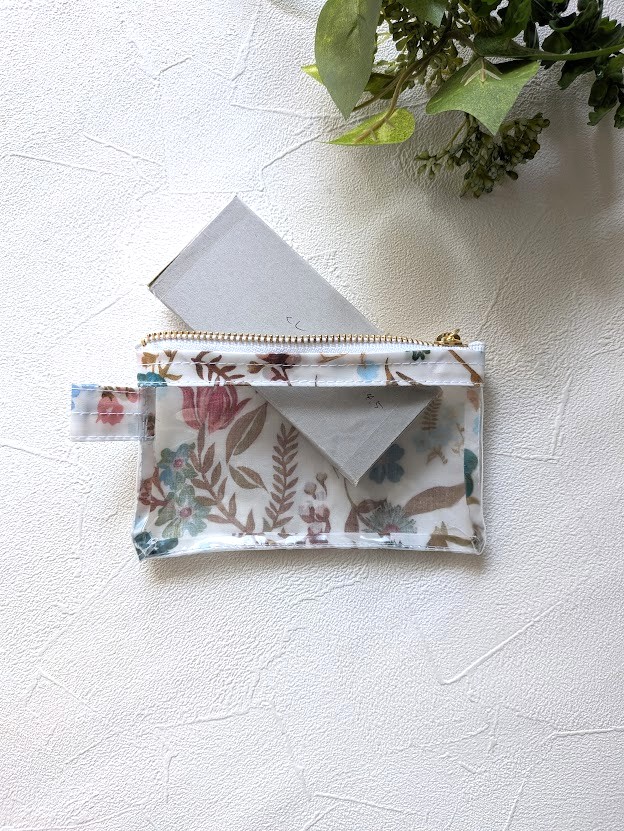このポーチの魅力は、リバティプリント×ラミネート生地×クリア生地の組み合わせ。ラミネート生地は水や汚れにも強く、日常使いにも安心。そこに透明なクリア素材を合わせることで、