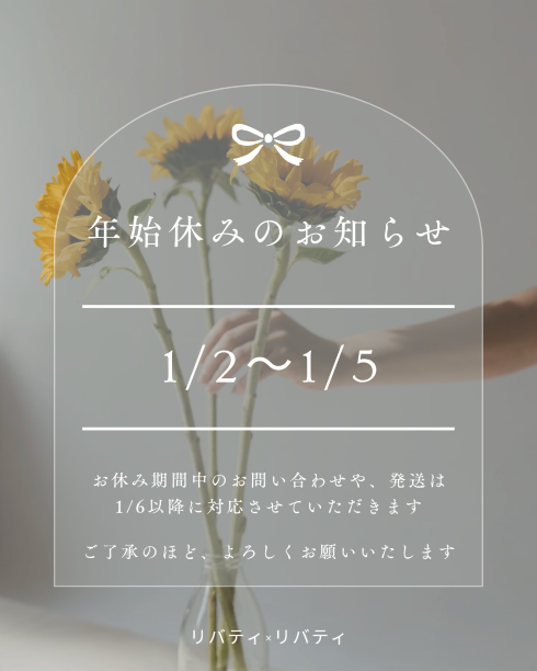 1月2日(金)〜5日(月)の期間、制作・発送・お問い合わせ対応をお休みさせていただきます。オンラインストアでのご注文は、休業期間中も通常通り承っておりますが、発送およびお問い合わせへのお返事は、1月6日(火)以降、順次対応となります。