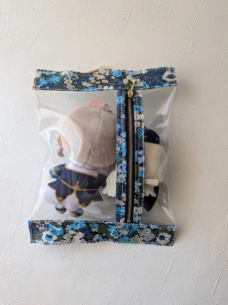 透明のポーチにぬいぐるみを入れて、バッグにぶら下げて持ち歩ける形で制作したものです。