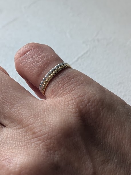 地金をミックスするだけで、いつものリングが少し今っぽく見えるのが面白いところ。