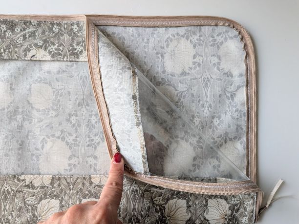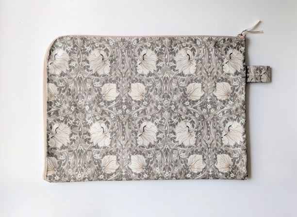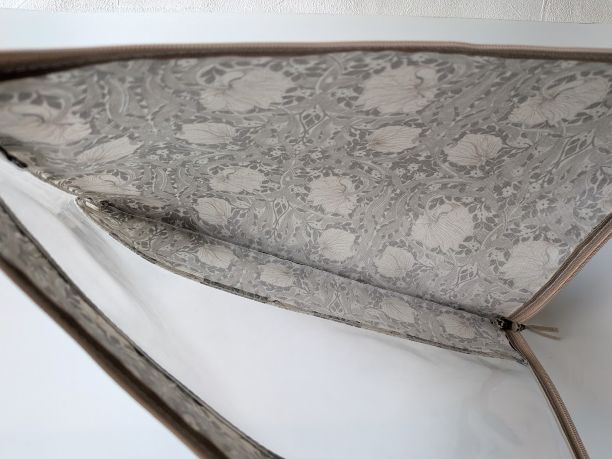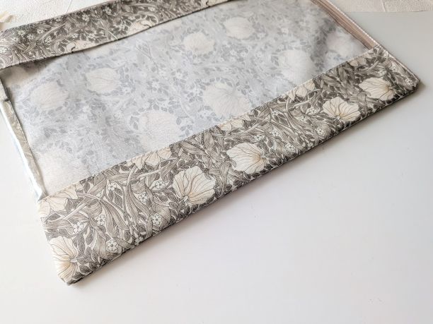 この生地はリバティのラミネートよりもやや固めでしっかりしており、大切な物をしっかり守るのに適しています。