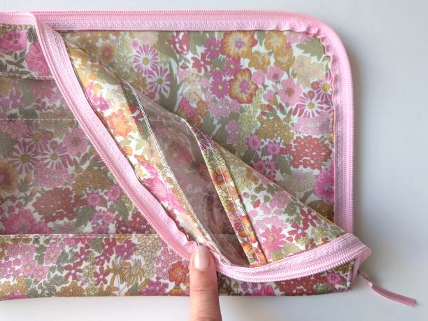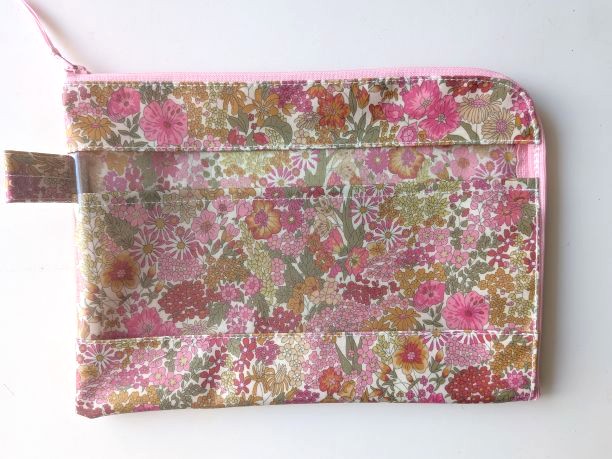 仕切り付き A5 L字ファスナークリアポーチ マーガレットアニー リバティ ラミネート ♡夏の庭園に次々に咲き誇る花々をひとつのデザインにまとめた柄