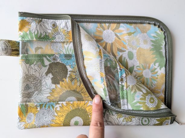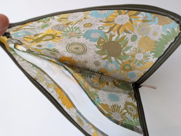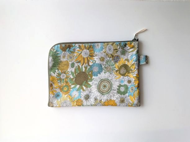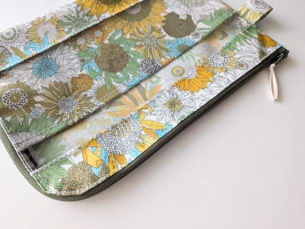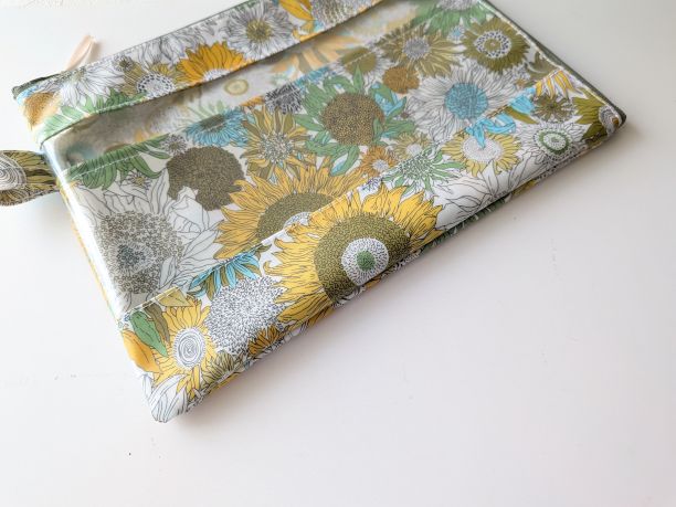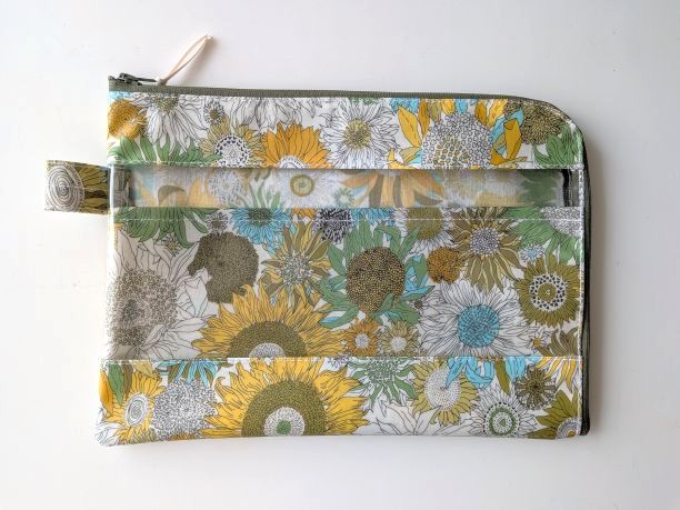 仕切り付き A5 L字ファスナークリアポーチ スモールスザンナ リバティ ラミネート ♡大小さまざまなひまわり | リバティ×リバティ