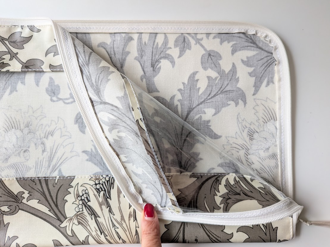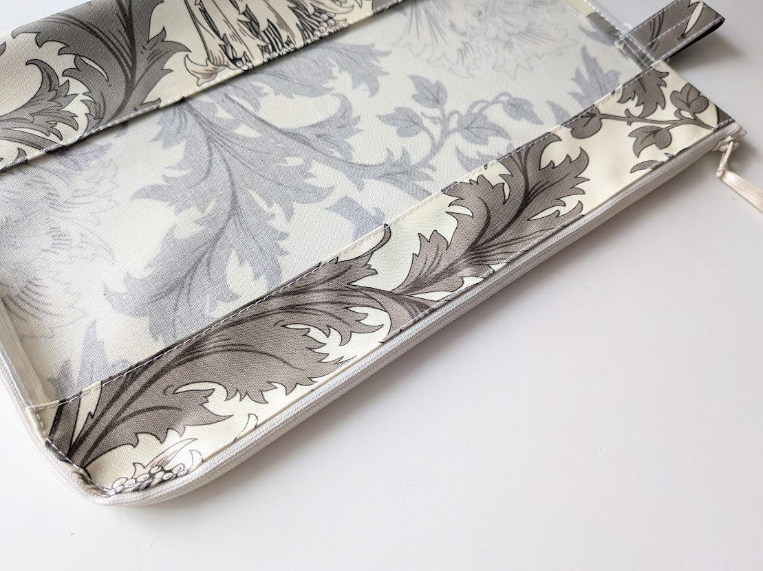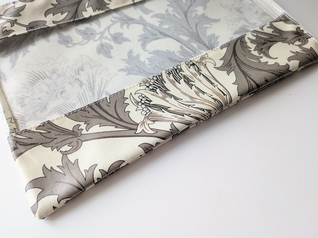 この生地はリバティのラミネートよりもやや固めでしっかりしており、大切な物をしっかり守るのに適しています。