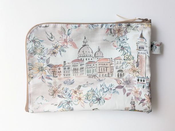 仕切り付き B6 L字ファスナークリアポーチ ヴェネツィア リバティ ラミネート ♡街の歴史的な建築、ロマンチックな橋、象徴的なゴンドラを魅力的な花のビネットの中に描いています | リバティ×リバティ