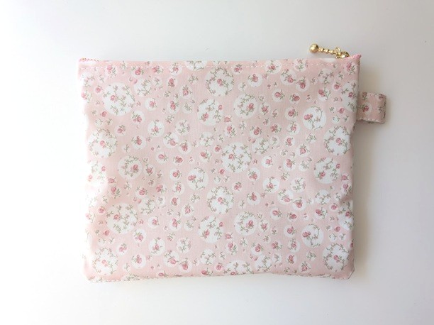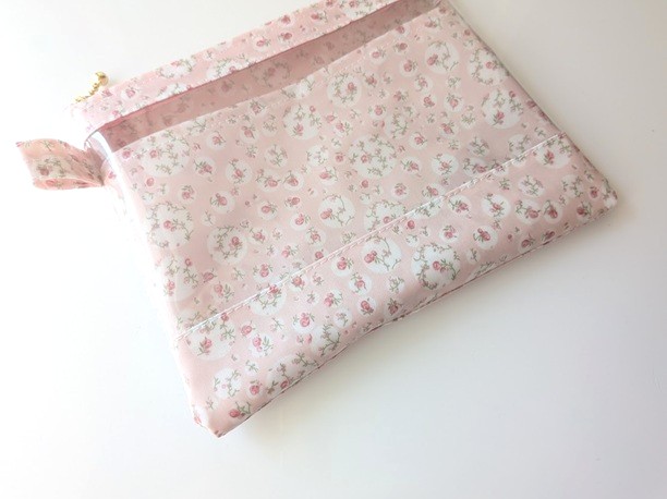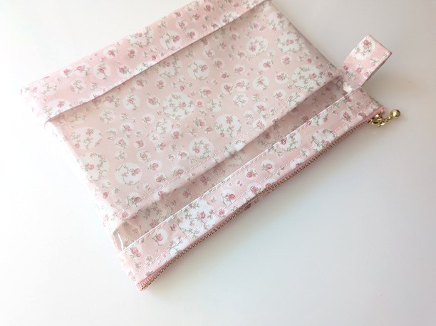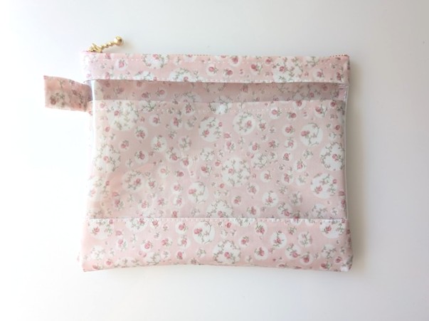 仕切りつきM-3 18.5×15 クリアポーチ ジョアンナ リバティ ラミネート ♡大小の様々なドットの中に小さなバラが散りばめられた、レトロ&ロマンチックなデザイン