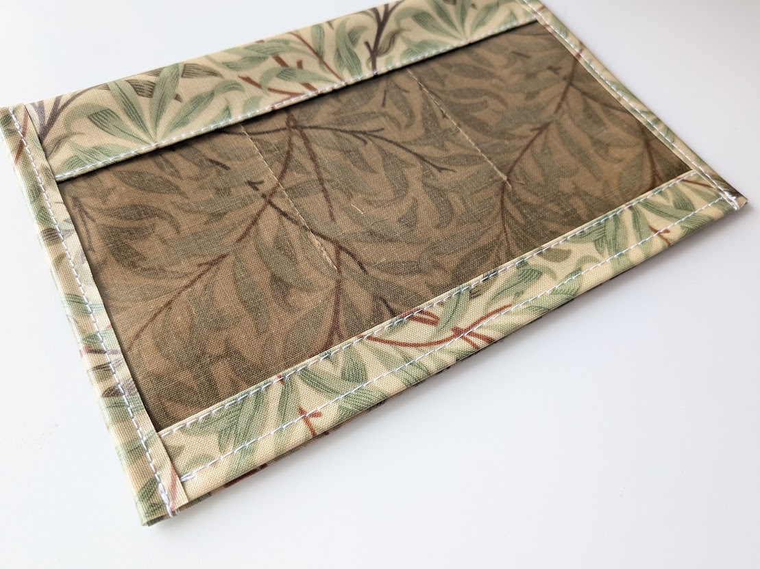 この生地はリバティのラミネートよりもやや固めでしっかりしており、大切な物をしっかり守るのに適しています。