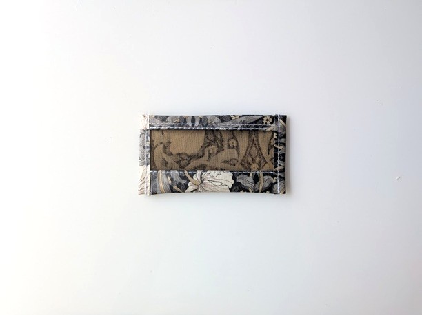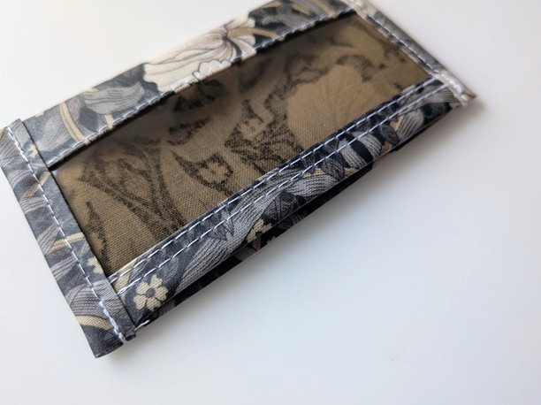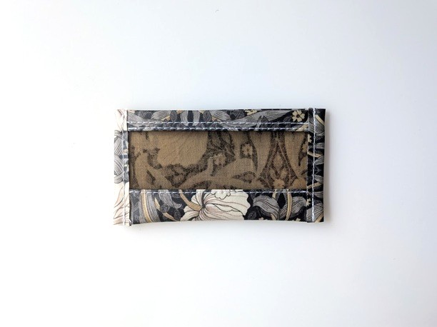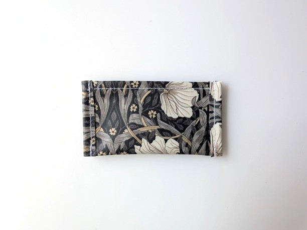 この生地はリバティのラミネートよりもやや固めでしっかりしており、大切な物をしっかり守るのに適しています。