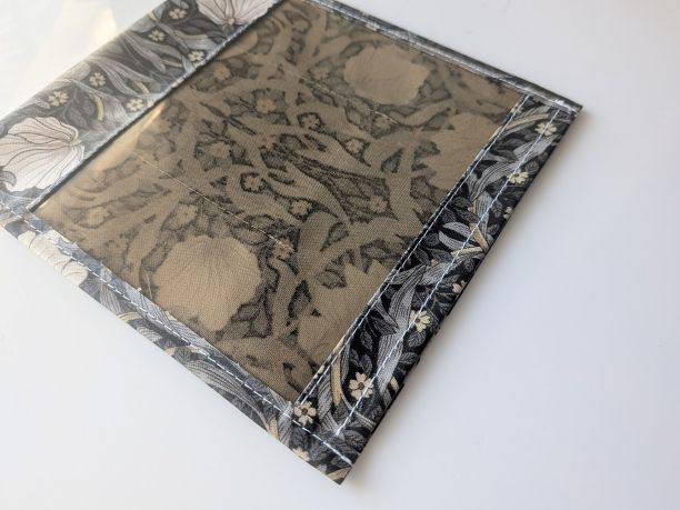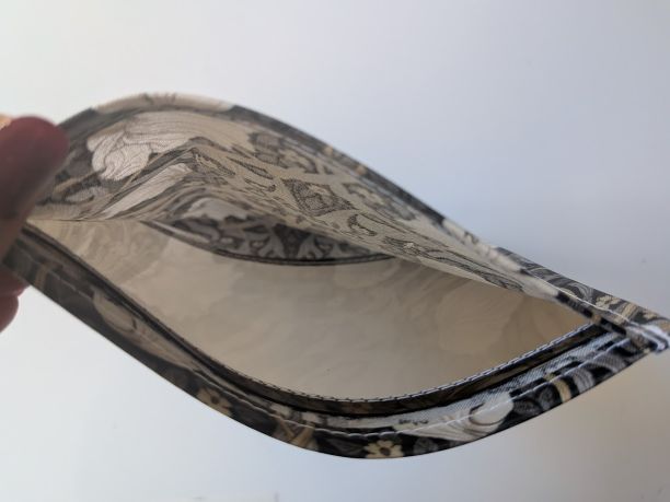 この生地はリバティのラミネートよりもやや固めでしっかりしており、大切な物をしっかり守るのに適しています。