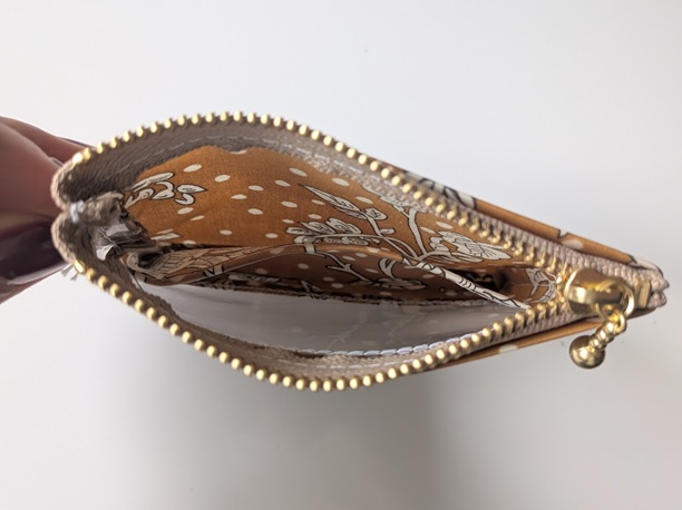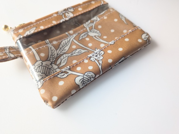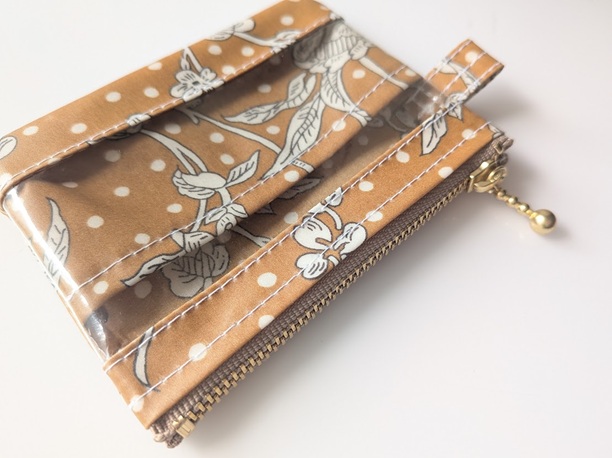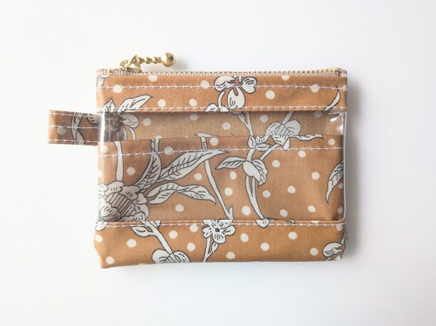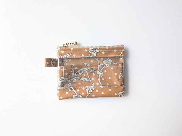 仕切り付きxxs-3 カードサイズ クリアポーチ マロリー リバティ ラミネート ♡水玉のベースデザインに手描きで、東洋の花々が上に向かってレイアウトされた柄です