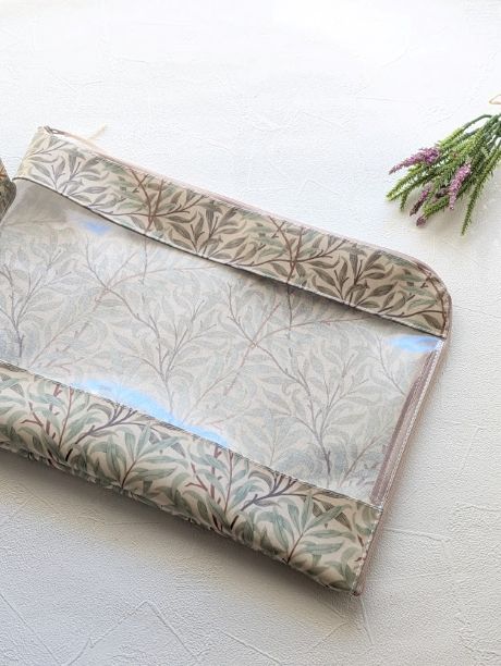 ラミネート素材ならではの扱いやすさと、ウィローボウの穏やかな柄が合わさり、実用性と美しさを兼ね備えたポーチに仕上げていきます。