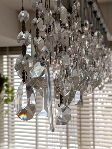 磨き終えたシャンデリア。光を取り戻したクリスタルを見ると、気持ちまで少し明るくなります。